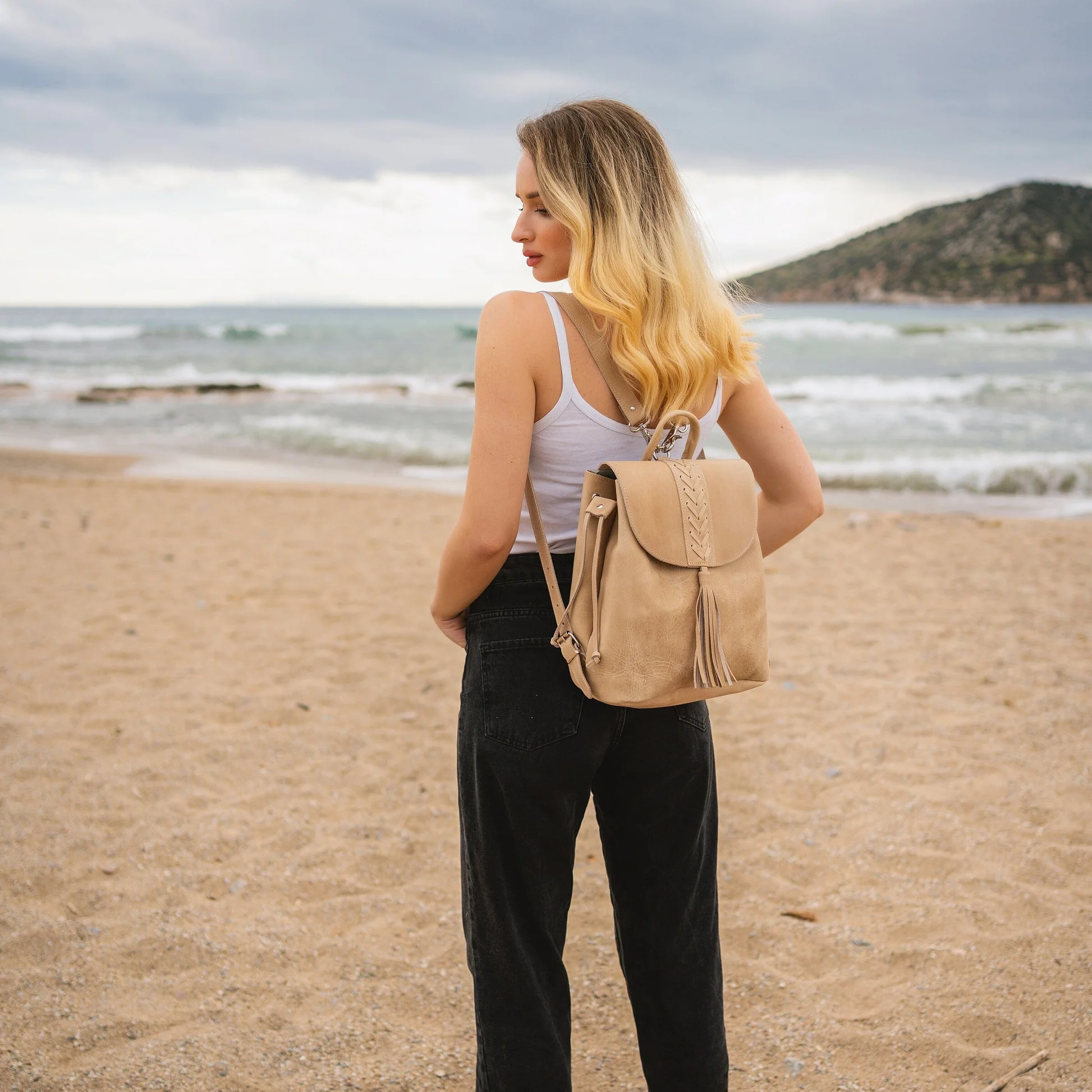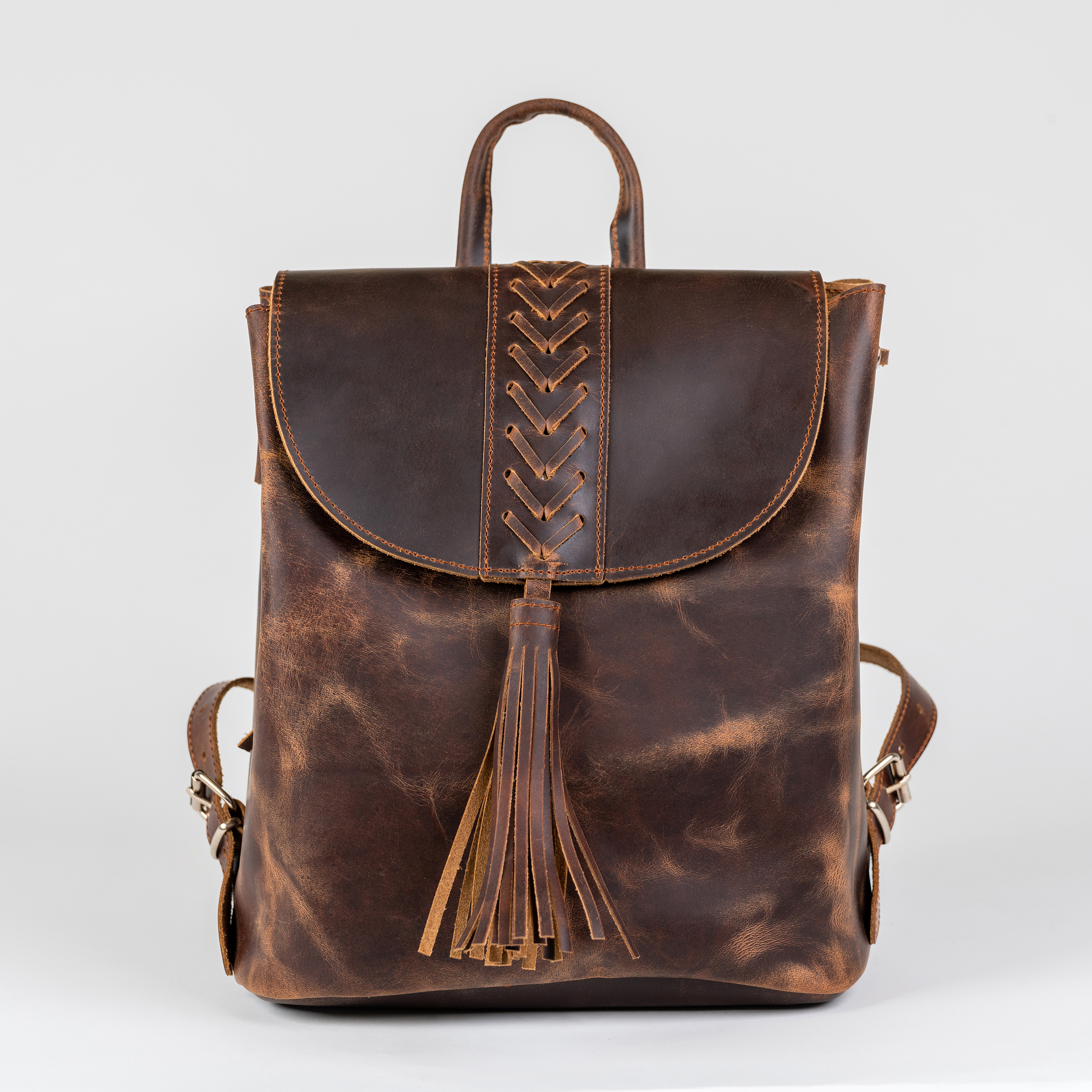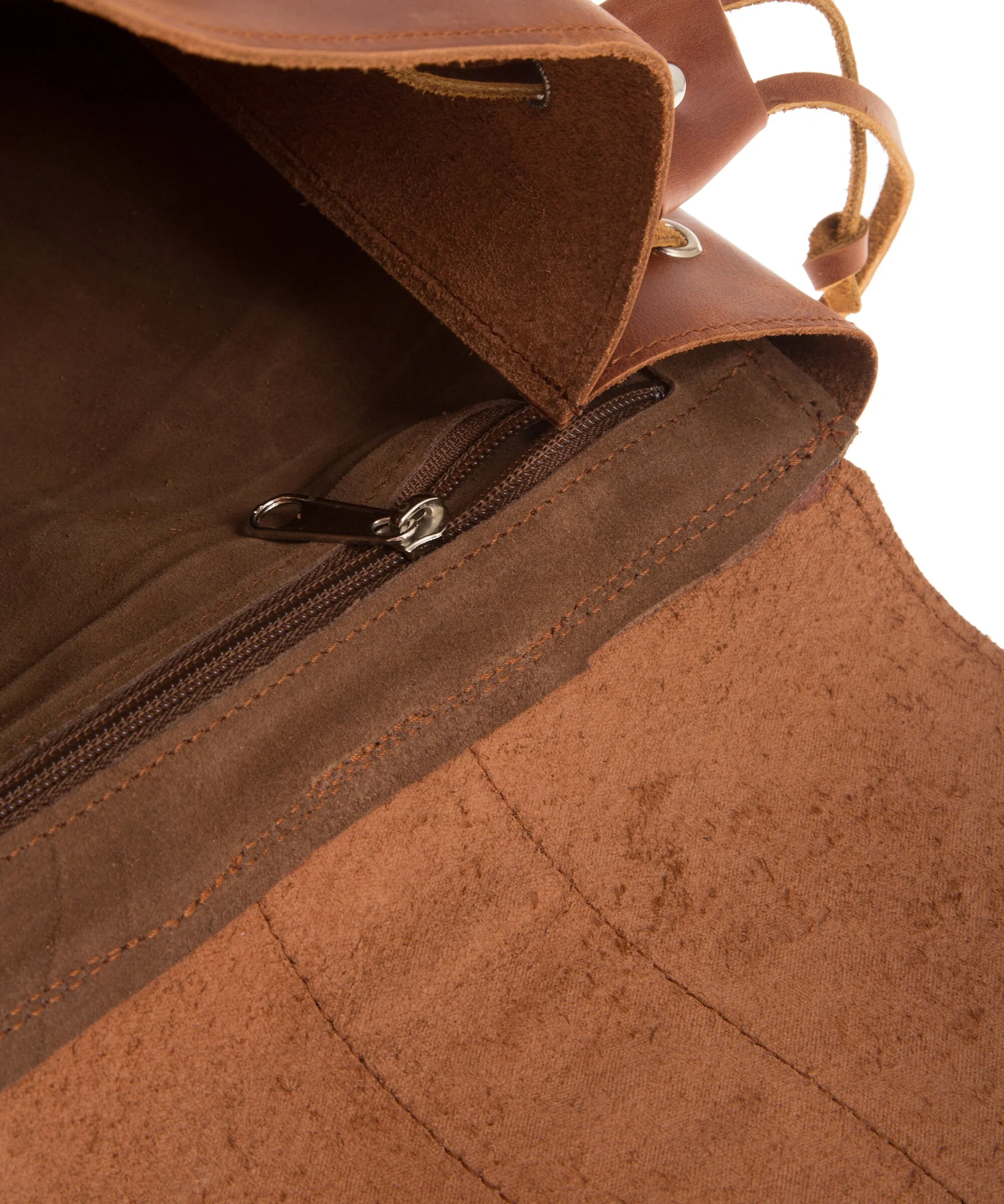 Backpack leather for women. This racksuck purse has one unified space inside with a zipped pocket. We love the cross stich in the front of the bag, a perfect hand crafted accessory for a woman, a life time leather bag made by using chemical-free natural tan leather.