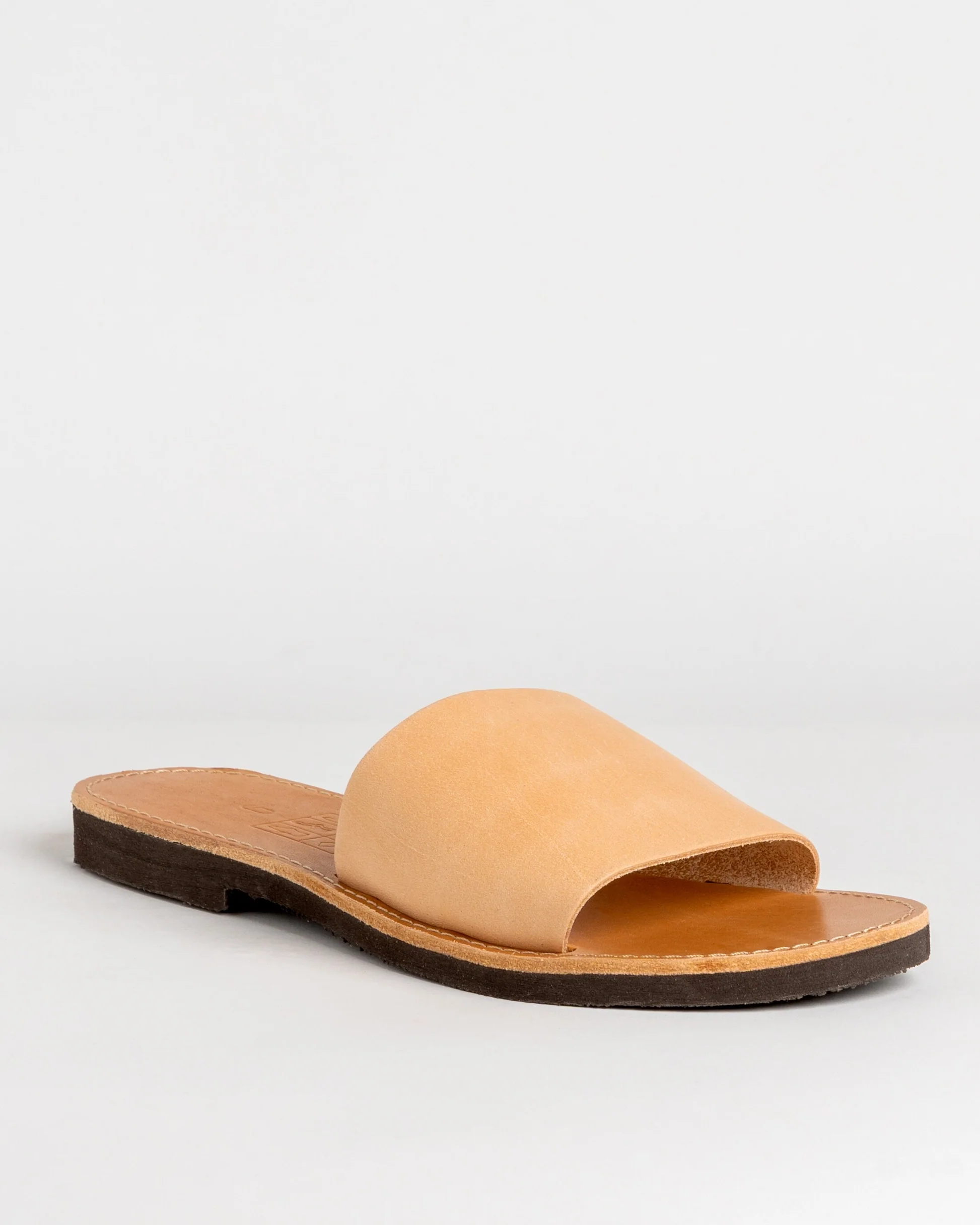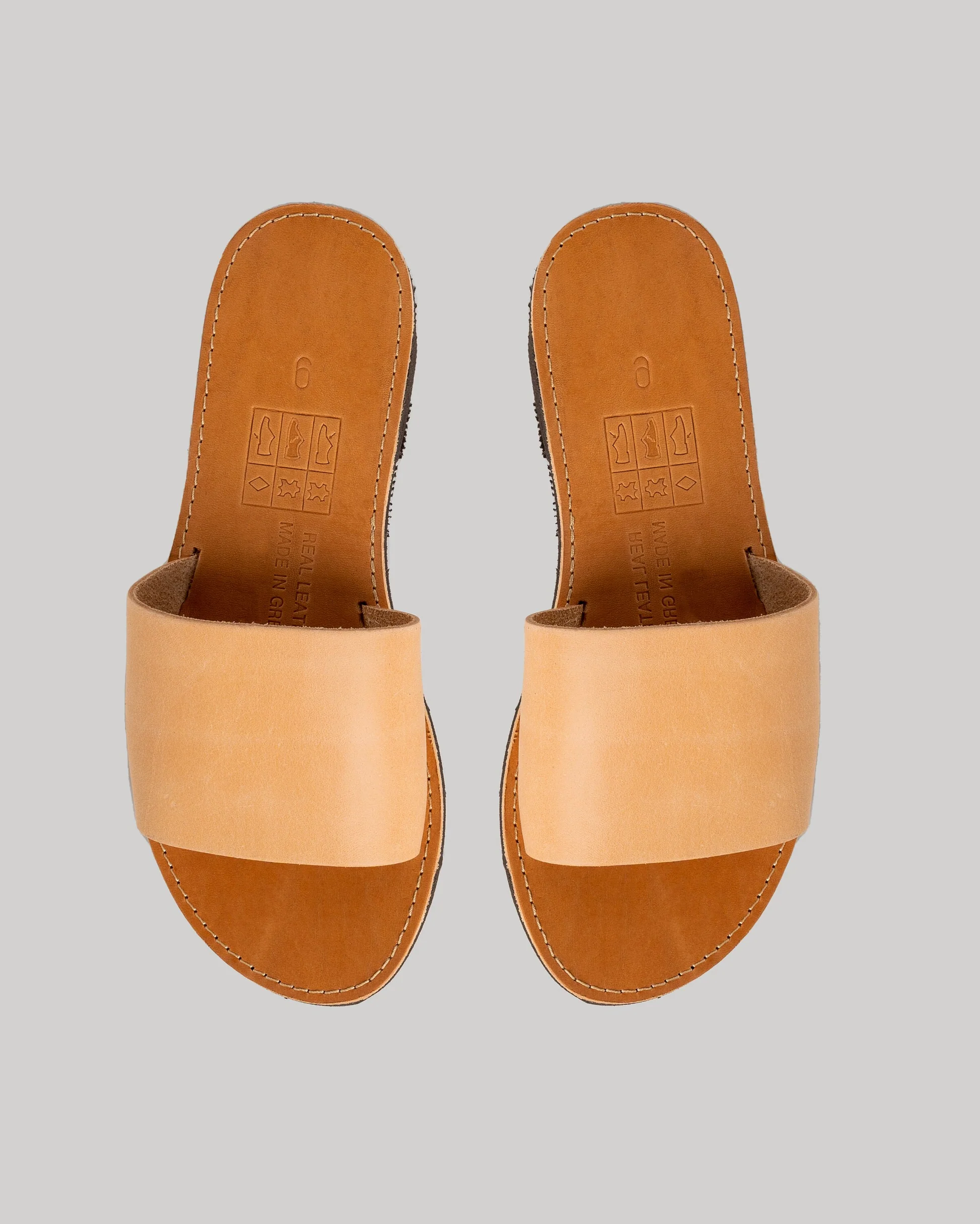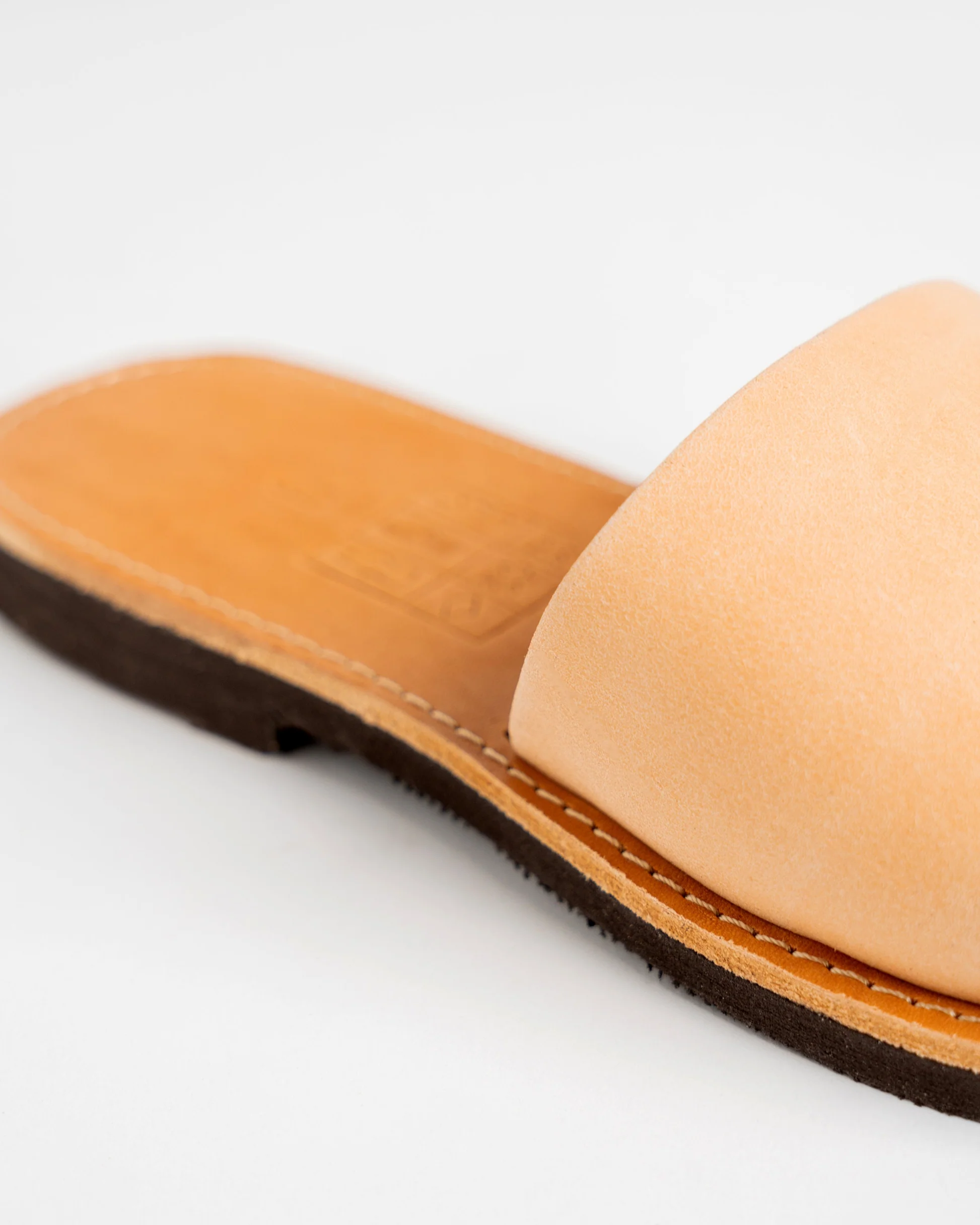 Elevate your style and comfort with our handmade leather women’s open-toe slide sandals. Crafted from chemical-free natural tan cow leather sourced from Crete. The lightweight sole ensures miles of safe walking, while the sandals’ impeccable shape is designed to last. Available in European sizing. Proudly made in Greece.