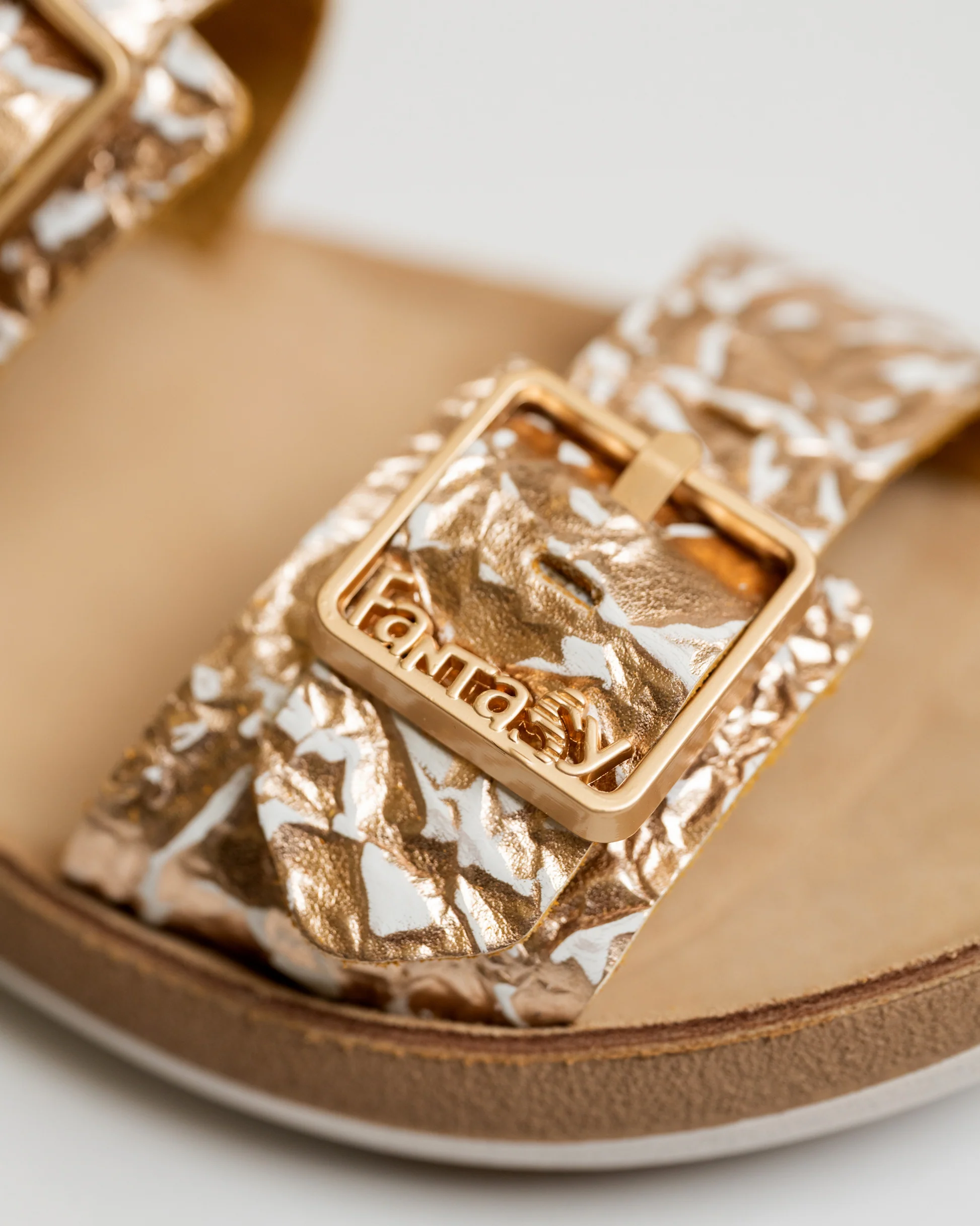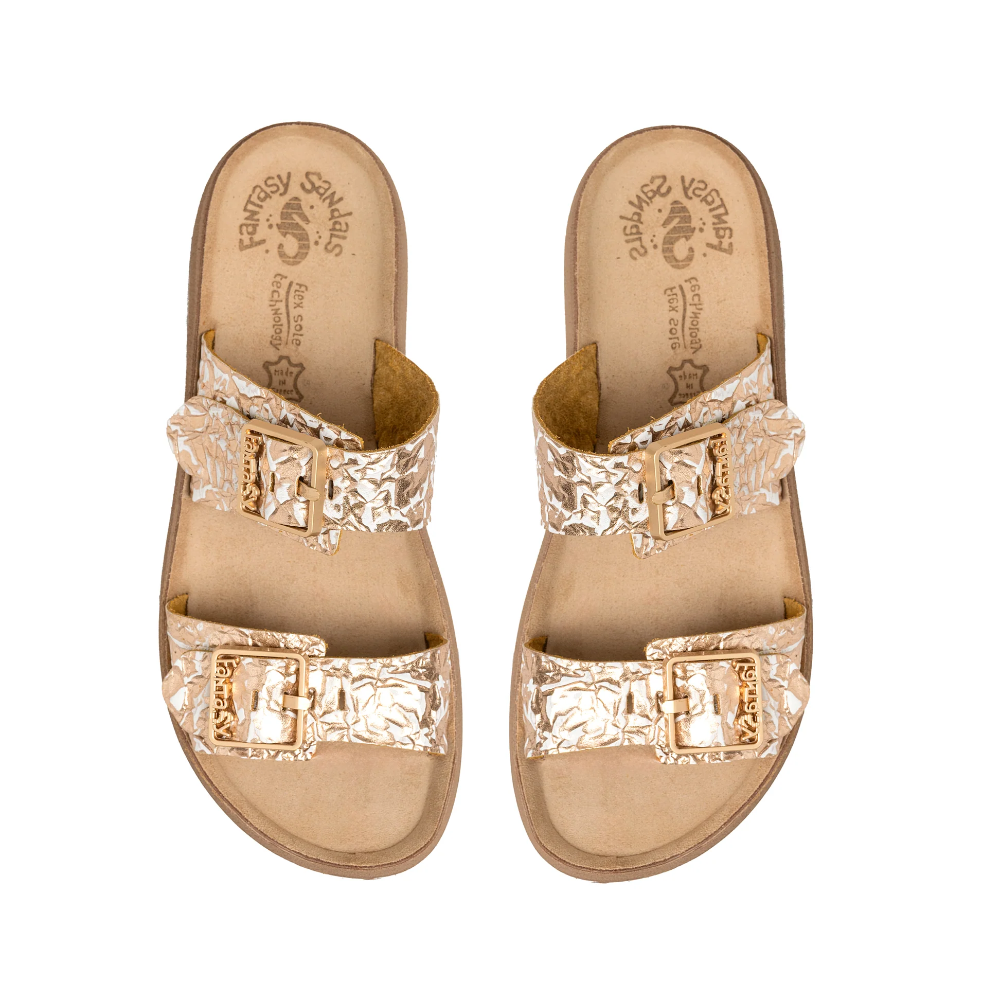 These eye-catching premium leather sandals feature a unique crinkled rose gold leather upper, complemented by two adjustable gold-tone buckles for a secure and customized fit. The contoured leather footbed with arch support ensures superior comfort for all-day wear. The striking rose gold color adds a touch of elegance to any outfit, making these sandals perfect for both casual and dressy occasions.