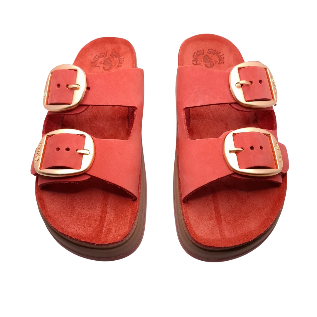 These vibrant coral sandals feature a double-strap design crafted from soft suede leather. Each strap is adorned with a large, gold-toned buckle that adds a touch of elegance and adjustability. Set on a slightly elevated sole for extra comfort, these sandals are perfect for adding a bold pop of color to your everyday summer look.