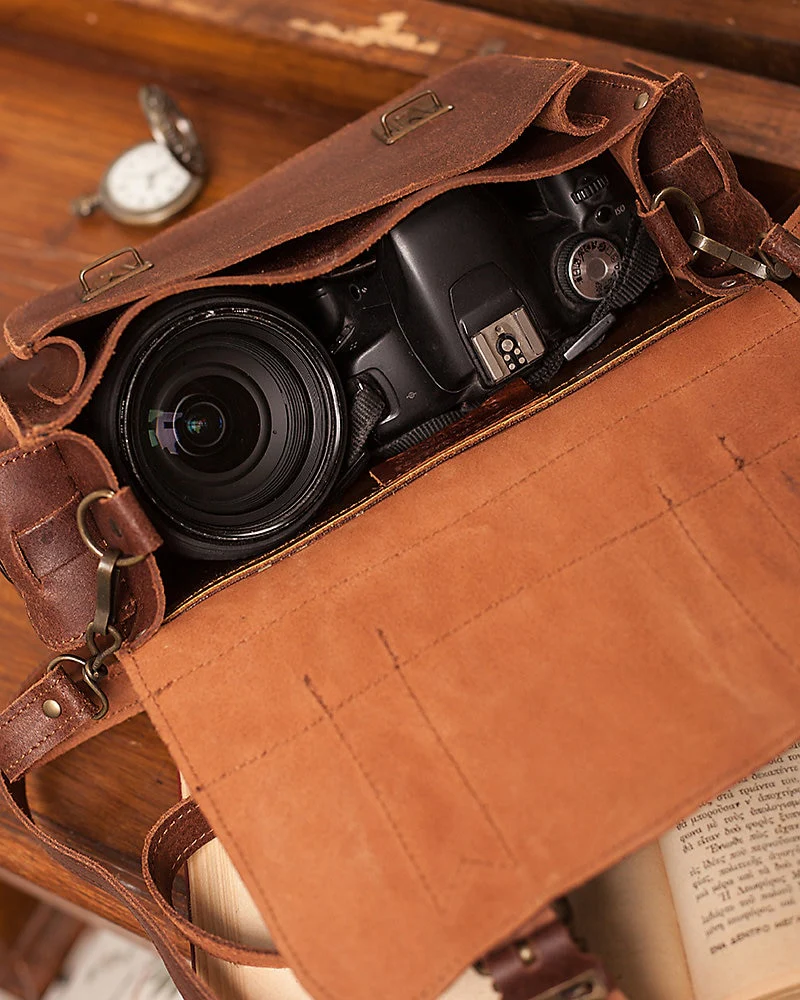 This camera case has one big space inside for your camera and your lens and a smaller one for your battery usb charge or maybe a second battery. It also has two different pockets from the side that you can also store different things. Inside you will also find an adjustable strap which converts the case from handbag to crossbody bag.