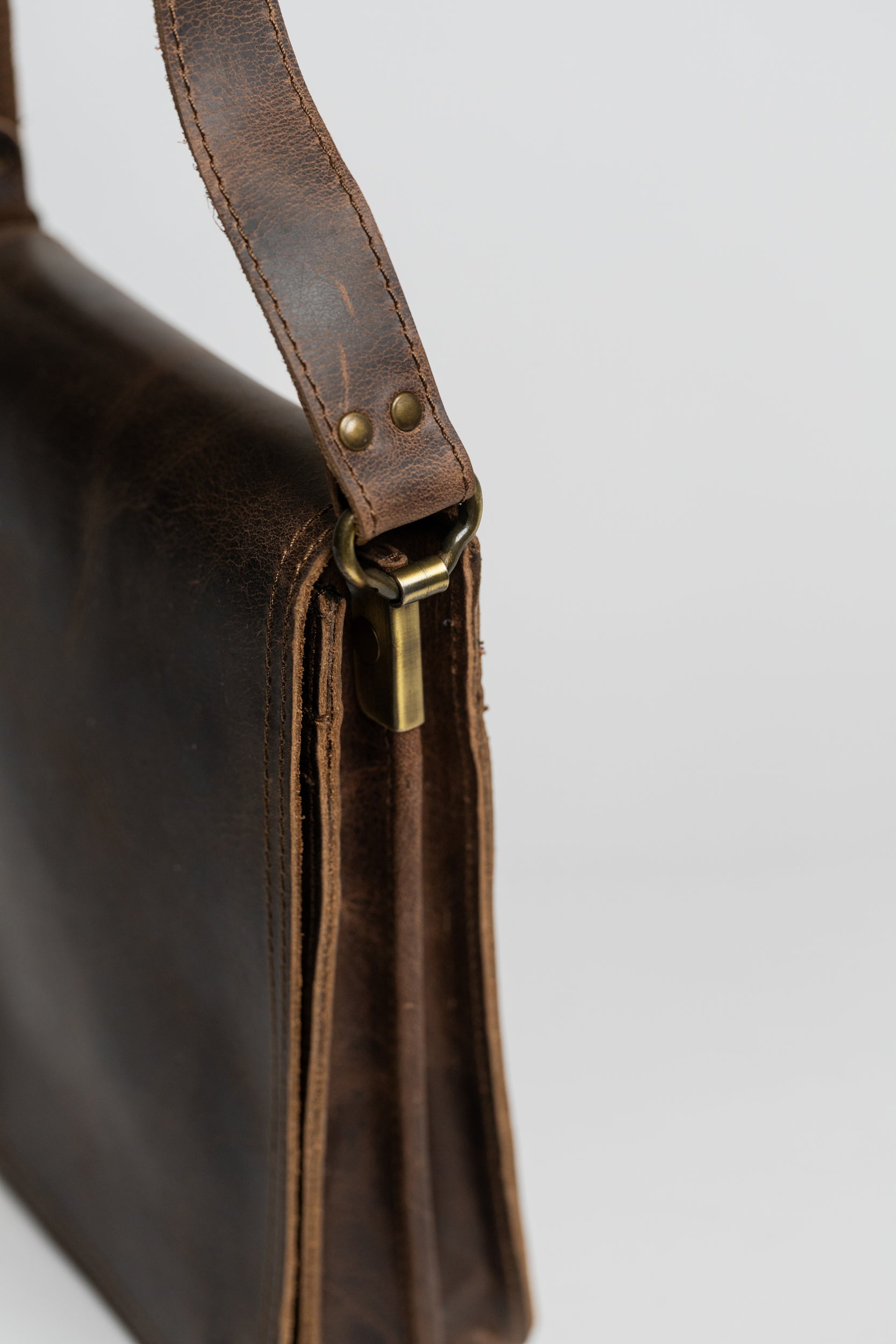 This leather bag features a spacious main compartment under a secure flap closure, ideal for carrying your daily essentials such as a tablet, phone, wallet, and keys. An internal pocket provides additional organization for smaller items. The adjustable leather strap ensures a comfortable fit, whether worn over the shoulder or across the body, making it versatile for various styles and needs.