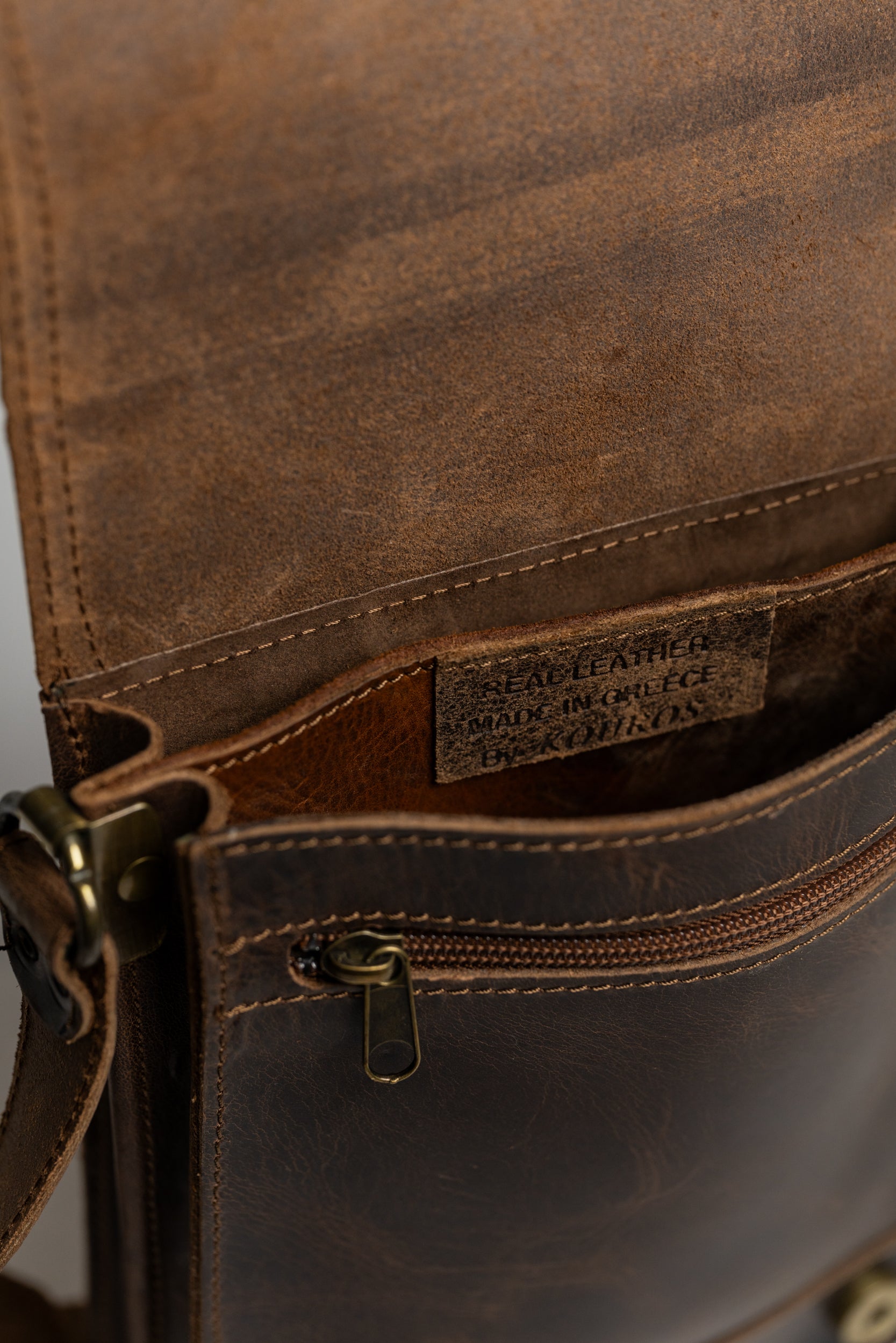Introducing our premium men's crossbody leather bag in a sophisticated waxed brown finish, designed for the modern man who appreciates both style and functionality. Crafted from top-quality genuine leather, this bag boasts durability and a timeless, rugged appeal that enhances with age. The waxed finish adds a layer of protection and a distinctive look, making it a perfect accessory for any occasion.