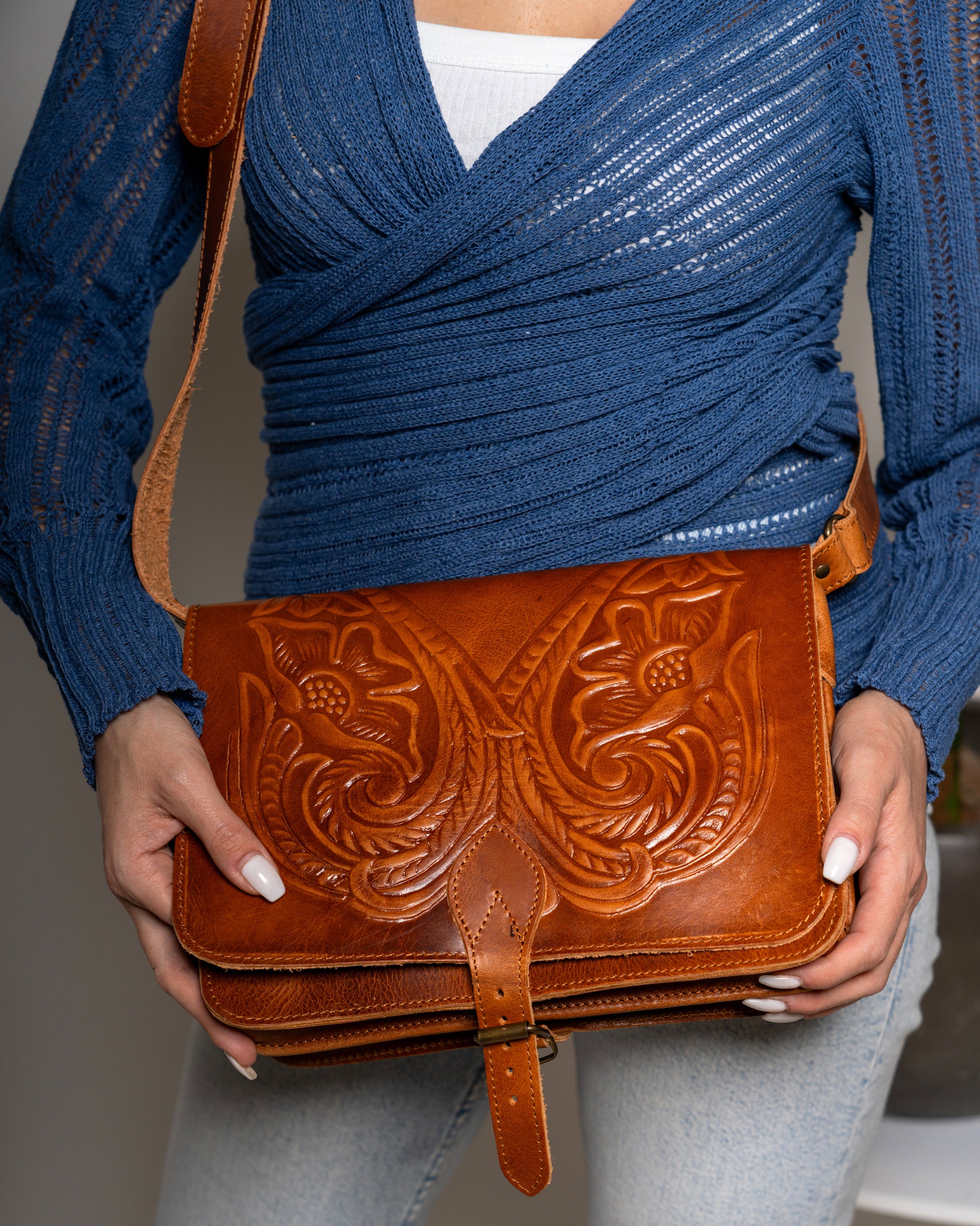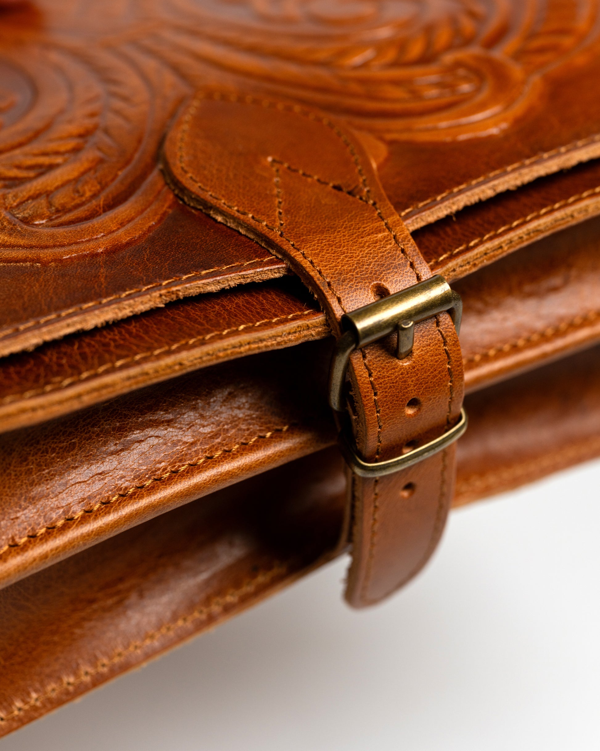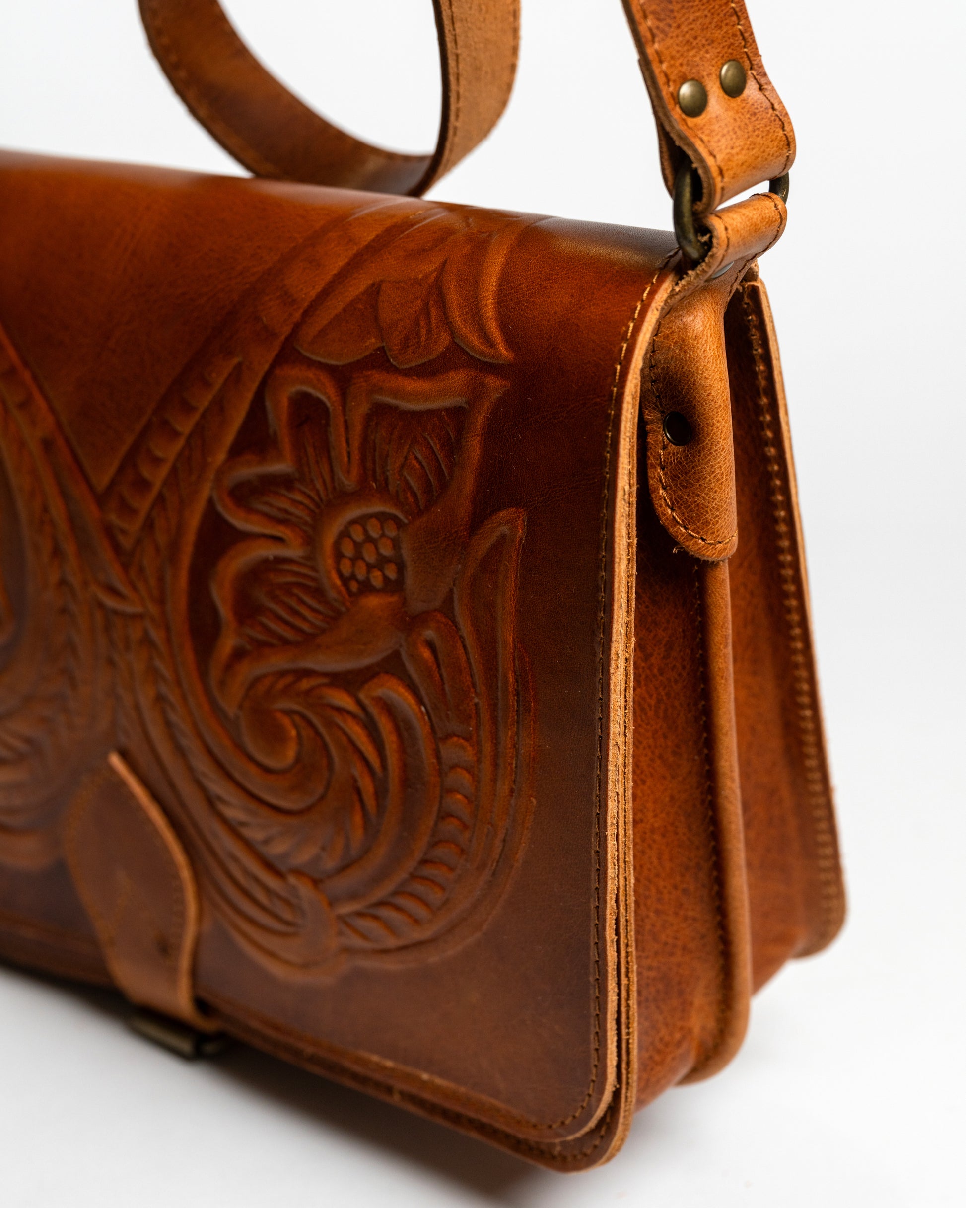 The front flap features a stunning, embossed floral design, meticulously crafted to add a touch of artisanal beauty to your accessory collection. Secured with a durable clasp, the flap ensures your belongings remain safe and secure. Inside, you'll find a spacious compartment perfect for carrying your essentials, whether for work, school, or leisure.