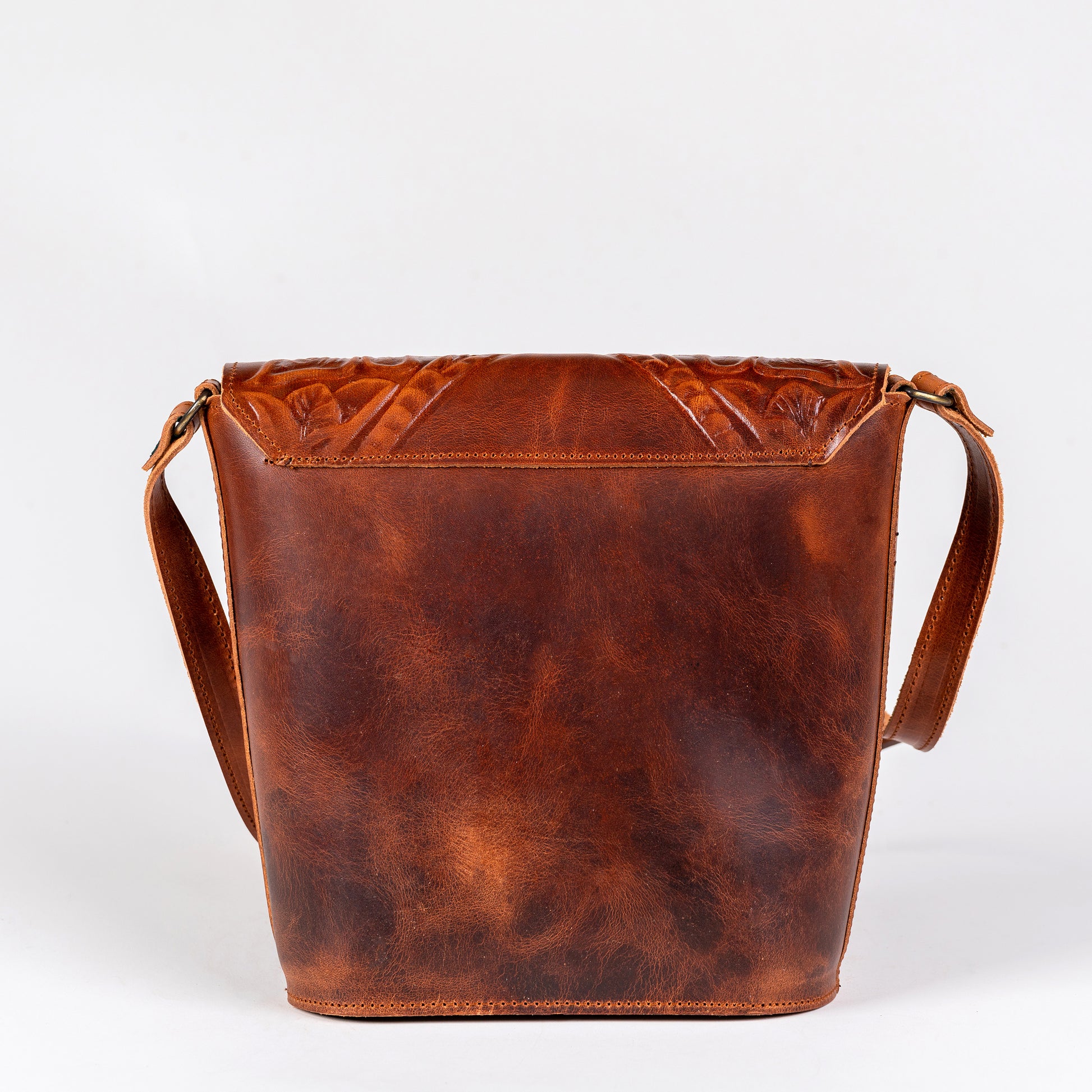 Introducing a boho-inspired crossbody bag crafted from the finest Greek cow leather. Its interior features a unified space, secured by a beautifully tooled leather slide and a magnetic clasp. The bag's round bottom comfortably accommodates all your everyday essentials, making it a perfect companion for any occasion.